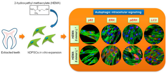 The main goal of this work was to demonstrate the involvement of autophagy in response to low concentrations 3 and 5 mmol L−1 of HEMA treatment in hDPSCs as an adaptive machinery to ensure cell homeostasis. For this purpose, the capacity of LC3, p62, and ERK signaling to counteract on the control of autophagy induced by HEMA treatment in stem cells from dental pulp was evaluated. Our findings provided evidence that hDPSCs express stemness markers [30], and are competent to differentiate into osteoblast and adipoblast lineages [27].