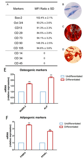 Huma Dental Pulp Stem Cells (hDPSC) characterization. (A) Cytofluorimetric detection of hDPSCs at second passage. Median Fluorescence Intensity (MFI) ratio is the average of five different biological samples ± standard deviation (SD); cutoff ratio positivity > 2.0. (B) Plastic-adherent hDPSCs observed by inverted light microscopy, stained with toluidine blue solution. (C) Osteogenic differentiated hDPSCs stained with Alizarin Red S solution. (D) Adipogenic differentiated hDPSCs stained with Adipo Oil red O solution. (E) Real Time-Polimerase Chain Reaction (RT-PCR) of Runt-related transcription factor 2 (RUNX2) and Alkaline Phosphatase (ALP) performed in undifferentiated and differentiated hDPSCs. (F) RT-PCR of Fatty Acid-Binding Protein 4 (FABP4) and Peroxisome Proliferator-Activated Receptor Gamma (PPARɣ) performed in undifferentiated and differentiated hDPSCs. Scale bar: 10 µm. ** p < 0.01.