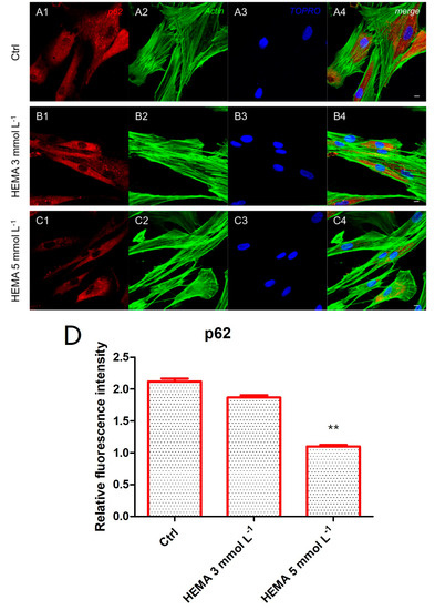p62 expression. (A1) Untreated cells showed a strong positive expression for p62 marker. (A2) Actin cytoskeleton in untreated hDPSCs. (A3) Nuclei in untreated hDPSCs. (A4) Merged picture of abovementioned channels in untreated hDPSCs. (B1) Cells treated with HEMA 3 mmol L−1 showed a positive expression for p62 marker. (B2) Cytoskeleton actin in HEMA 3 mmol L−1 p62 treated hDPSCs. (B3) Nuclei in HEMA 3 mmol L−1 treated hDPSCs. (B4) Merged picture of abovementioned channels in HEMA 3 mmol L−1 treated hDPSCs. (C1) Cells treated with HEMA 5 mmol L−1 showed a low positive expression for p62 marker. (C2) Actin cytoskeleton in HEMA 5 mmol L−1 treated hDPSCs. (C3) Nuclei in HEMA 5 mmol L−1 treated hDPSCs. (C4) Merged picture of abovementioned channels in HEMA 5 mmol L−1 treated hDPSCs. (D) The relative fluorescent intensity of p62 was analyzed using NIS-Elements AR imaging software. Data are presented as the mean of thirty measurements ± standard deviation. ** p < 0.01. Green fluorescence: actin cytoskeleton, red fluorescence: p62, blue fluorescence: nuclei. Magnification: 63×. Scale bar: 10 µm.
