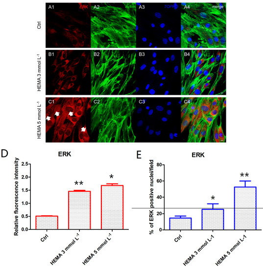 ERK expression. (A1) Untreated cells showed a low positive expression for ERK. (A2) Actin cytoskeleton in untreated hDPSCs. (A3) Nuclei in untreated hDPSCs. (A4) Merged picture of abovementioned channels in untreated hDPSCs. (B1) Cells treated with HEMA 3 mmol L−1 showed a positive expression for ERK. (B2) Actin cytoskeleton in HEMA 3 mmol L−1 treated hDPSCs. (B3) Nuclei in HEMA 3 mmol L−1 treated hDPSCs. (B4) Merged picture of abovementioned channels in HEMA 3 mmol L−1 treated hDPSCs. (C1) Cells treated with HEMA 5 mmol L−1 showed a strong positive expression for ERK, with a nuclear localization (arrows). (C2) Actin cytoskeleton in HEMA 5 mmol L−1 treated hDPSCs. (C3) Nuclei in HEMA 5 mmol L−1 treated hDPSCs. (C4) Merges picture of abovementioned channels in HEMA 5 mmol L−1 treated hDPSCs. (D) The relative fluorescent intensity of ERK was analyzed using NIS-Elements AR imaging software. Data are presented as the mean of 30 measurements ± standard deviation. (E) Analysis of the percentage of ERK-positive nuclei/field. * p < 0.05; ** p < 0.01. Green fluorescence: actin cytoskeleton, red fluorescence: ERK, blue fluorescence: nuclei. Magnification: 63×. Scale bar: 10 µm.