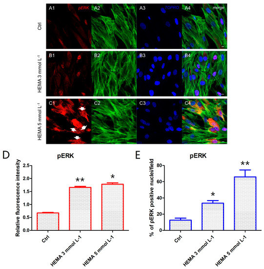 pERK expression. (A1) Untreated cells showed a low positive expression for pERK. (A2) Actin cytoskeleton in untreated hDPSCs. (A3) Nuclei in untreated hDPSCs. (A4) Merged picture of abovementioned channels in untreated hDPSCs. (B1) Cells treated with HEMA 3 mmol L−1 showed a positive expression for pERK. (B2) Actin cytoskeleton in HEMA 3 mmol L−1 treated hDPSCs. (B3) Nuclei in HEMA 3 mmol L−1 treated hDPSCs. (B4) Merged picture of abovementioned channels in HEMA 3 mmol L−1 treated hDPSCs. (C1) Cells treated with HEMA 5 mmol L−1 showed a strong positive expression for pERK, with a nuclear localization (arrows). (C2) Actin cytoskeleton in HEMA 5 mmol L−1 treated hDPSCs. (C3) Nuclei in HEMA 5 mmol L−1 treated hDPSCs. (C4) Merged picture of abovementioned channels in HEMA 5 mmol L−1 treated hDPSCs. (D) The relative fluorescent intensity of pERK was analyzed using NIS-Elements AR imaging software. Data are presented as the mean of 30 measurements ± standard deviation. (E) Analysis of the percentage of pERK-positive nuclei/field. * p < 0.05; ** p < 0.01. Green fluorescence: actin cytoskeleton, red fluorescence: pERK, blue fluorescence: nuclei. Magnification: 63×. Scale bar: 10 µm.