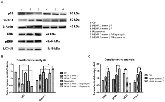Beclin-1 and P62 are classical autophagic markers. To evaluate their expression, Western blot analyses were performed. The protein levels of p62 decreased in HEMA 3 and 5 mmol L−1 treated samples, while Beclin1-specific protein bands showed an up-regulation in treated cells (Figure 8A). In particular, the results were enhanced in samples treated with rapamycin, an autophagic inductor (Figure 8B).The expression of ERK, pERK, and LC3-I/II was increased in HEMA 3 and 5 mmol L−1 treated cells when compared to the control (p < 0.05). All experiments were repeated in triplicate. (Figure 8C).
