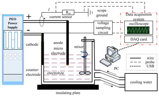 The experimental platform used to study PEO is shown in Figure 1. A home-made 20 kW pulse power supply was used, which could provide a DC voltage ranging from 0 to 1000 V and pulses with the same magnitude and frequencies up to 20 kHz [25]. In this study, small area sample monitoring of currents in individual discharges was used to study the nature of these discharges and their distributions in time and position. In order to provide a sufficiently small area, micro-electrodes made of aluminum wires were chose as specimens. Pure aluminum wires (99.99%) with 0.6 mm diameter were anodized in electrolyte, which was composed of commercial distilled water, 5 g/L potassium hydroxide (KOH) and 10 g/L sodium silicate (Na2SiO3). Experiments were carried out at 25 °C in a 2-liter water-cooled stainless steel tank, which also served as the counter-electrode.