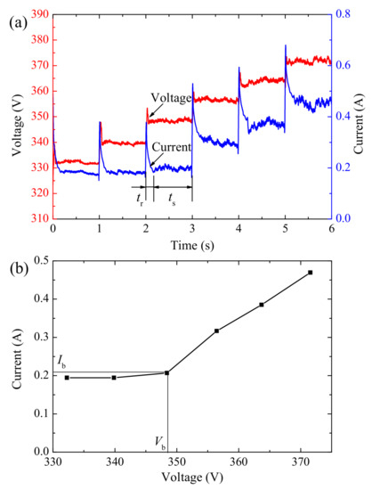 Figure 2a shows the partial voltage and current waveforms during the pre-treatment process of aluminum wires. In addition, dielectric breakdown of the oxide films when the potential was increased to approximately 350 V is shown in the figure. Within tr, a rise of potential results in an abrupt increase in current due to the active capacitive effect of the electrolyte load. After reaching a peak, the current decreases exponentially to a relatively stable level (within ts). When potential is lower than 340 V, stable levels are almost equivalent to 0.2 A. Above 350 V, the stable level increases with potential with an oscillating current waveform. This probably indicates that dielectric breakdown of oxide films occurred. Before dielectric breakdown, the applied voltage is not high enough to cause discharge and the load keeps in a stable high impedance. So, the current waveform is relatively smooth.