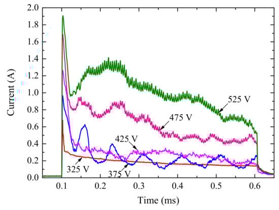 Similar current transients were observed for pulse voltages ranging from 325 to 525 V with a pulse duration of 500 μs (shown in Figure 4). With an increase in the pulse duration, differences among these pulses were prominent. For the pulse potential lower than 375 V, current transient was relatively smooth and decreased almost linearly with time. When the pulse potential was higher than 375 V, oscillation due to spark discharge was observed in the current transient due to dielectric breakdown of the coatings. For the same pulse potential, the effective value of the pulse current is inversely proportional to the pulse duration. This suggests the existence of a more reactive component in the overall current corresponding to the shorter pulses, due to the initial capacitor charging process.