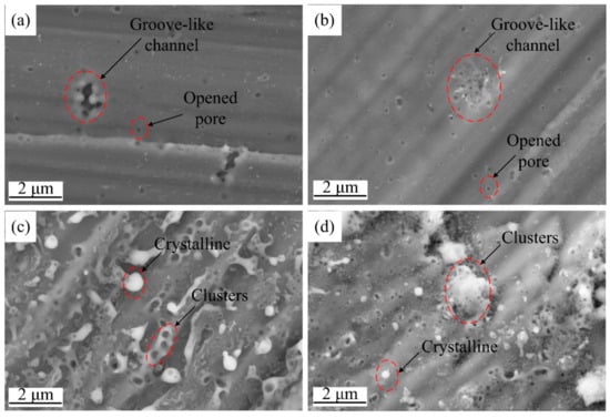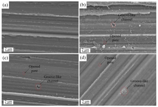 Figure 6 shows the surface SEM images of the specimens after applying a 400 V pulse for different pulse widths. When shorter pulses of 100 μs and 500 μs were applied, circular discharge channels with opened pores were found in addition to the groove-like channels, as shown in Figure 6a,b. These surface morphologies are similar to those shown in Figure 5. However, after breakdown, surface morphology for longer duration pulses was found to be significantly different, as shown in Figure 6c,d.