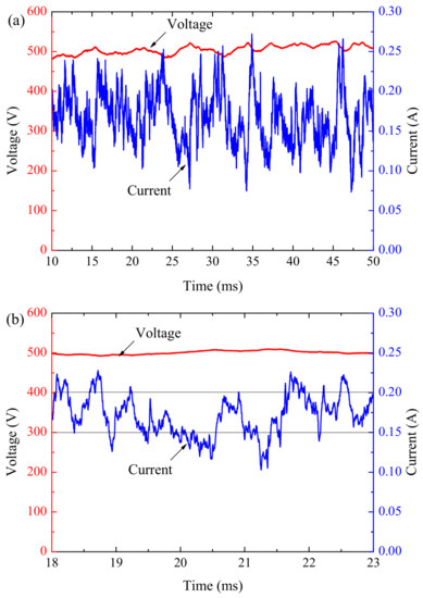 Raw voltage and current data had considerable electrical noise due to mechanical vibration, electron avalanche, dielectric breakdown and high frequency electronic switching. As a result, it was necessary to carry out post-processing for data. The data were first filtered with a low pass filter with a cut-off frequency of 50 kHz. This allowed high frequency noise due to the electronic switching to be eliminated. Next, this data was smoothened using moving average filter. Finally, an appropriate scale function and wavelet basis function were adopted to extract random noise signal.