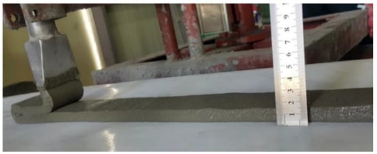 Extrudability, also referred to as printability, is an indicator of the extent to which a printing material is smoothly and continuously extruded from the nozzle of a 3D printer. Extrudability depends on flowability and is influenced by constituents in the cementitious mixtures, including type, properties, quantity, moisture content, the presence of additives, delivery system of the printing material, and time. Extrudability is evaluated by the rate (cm/min or cm/s) at which cementitious mixtures are extruded through the nozzle head of the 3D printer. Extrudability is determined by taking the continuous length of cementitious mixture extruded and dividing by the time taken for extrusion. An image of the extrudability test is shown in Figure 6.