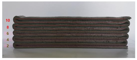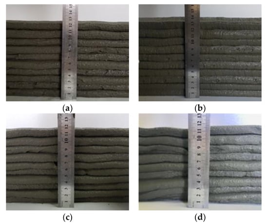 The results of the buildability test when the flow of the EVA-modified cementitious mixtures was 65% are shown in Figure 9. From these results, it can be seen that there were no cracks on the surface of the layer at the point where the direction of the nozzle head was changed, with the exception of when the EVA/cement ratio was 0. The best buildability occurred when the EVA/cement ratio was 0.15 because this showed the smoothest surfaces of the layers. These results are similar to reports stating that the occurrence of cohesion due to viscosity provides excellent resistance to bleeding and segregation, even though polymer-modified cementitious mixtures—as compared to ordinary cementitious mixtures—have larger flowability characteristics [].