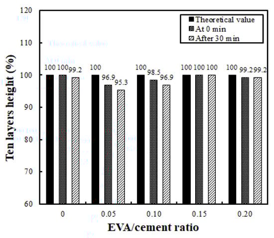 Buildability is the most critical factor in the fresh properties of EVA-modified cementitious mixtures used for printing. A performance test is only possible if the flowability and extrudability discussed above are adequate. The buildability test in the present research was conducted by evaluating the height of a 10-layer stack with a unit length of 50 cm, both immediately after completion and once 30 min had passed. Figure 8 compares the height reduction rate immediately after being stacked and 30 min later, based on a theoretical value obtained by multiplying the height of the first initial layer by 10 (layers). The results show that the reduction rate of the stack height did not differ significantly with the EVA/cement ratio, demonstrating a relatively good buildability. The most stable buildability occurred when the EVA/cement ratio was 0.15; there was no vertical change in the stacked layers.