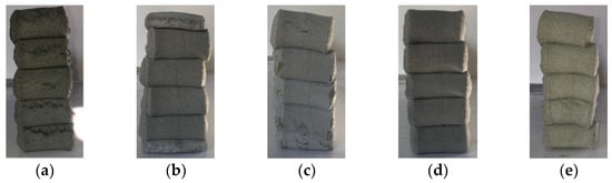 Views of buildability test at 65% flow: (a) EVA/cement ratio: 0; (b) EVA/cement ratio: 0.05; (c) EVA/cement ratio: 0.10; (d) EVA/cement ratio: 0.15 and (e) EVA/cement ratio: 0.20.