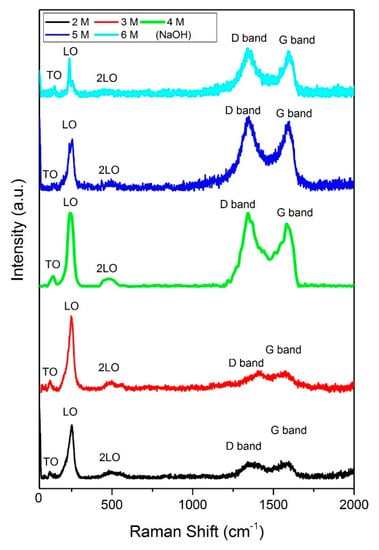 Raman spectroscopy was used to identify the graphene oxide phase in the sample. Figure 2 shows the Raman spectra for all the samples synthesized using different concentrations of NaOH. Five peaks were observed at wavenumbers of ~115.4 cm−1, ~244.5 cm−1, ~499.7 cm−1, ~1351.2 cm−1 and ~1592.6 cm−1, which signified the formation of a ZnSe/GO composite. The peaks at ~115.4, ~244.5 and ~499.7 cm−1 are indexed to the transverse optical (TO), longitudinal optical (LO) and second order longitudinal optical (2LO) mode of the ZnSe compound [27,28]. On the other hand, at higher wavelengths, two peaks are observed around ~1351.2 (D band of graphene oxide) and ~1592.6 cm−1 (G band of graphene oxide). Similar to the previous session, the result is in agreement with the data reported by Lee et al., 2017 who synthesized a cactus-like ZnSe/GO composite [20]. Therefore, the proposed reaction mechanism of the formation of ZnSe, which is similar to Feng et al. [29] is described as below: