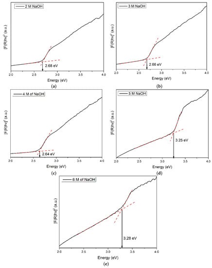 Kulbeka–Munk approach for samples synthesized with (a) 2 M, (b) 3 M, (c) 4 M, (d) 5 M, and (e) 6 M of NaOH.