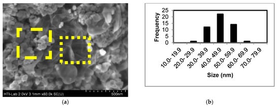 Figure 5 shows FESEM images of the sample synthesized using 4 M of NaOH. The average particle size of the sample was calculated. Furthermore, the particle size distribution graph of the sample was plotted.