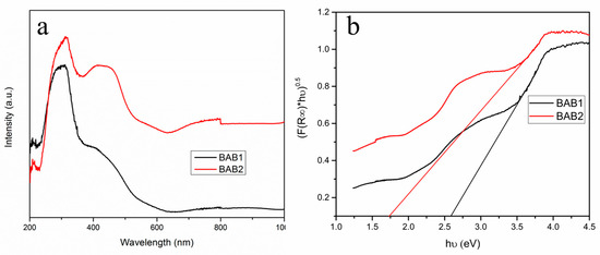 (a) Ultraviolet–visible diffuse reflectance spectra (UV-Vis DRS) and (b) determination of indirect interband transition energies for BAB1 and BAB2.