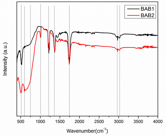 FT-IR spectra of BiOCl/AgCl/BiVO4 synthesized at pH = 1.2 (BAB1) and BiOCl/AgCl/BiVO4 synthesized at pH = 4 (BAB2).