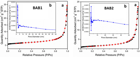 The nitrogen-adsorption-desorption isotherms of the samples were examined to find out the specific surface areas and pore size distribution at different synthesized pH values (Figure 5). For all samples, the isotherm is type IV Brunauer-Deming-Deming-Teller (BDDT classification), with very narrow hysteresis loops at high relative pressures, P/P0, indicating bimodal pore size distributions in the mesoporous region. Furthermore, high absorption at high P/P0 ranges indicates the formation of large mesopores. The shape of hysteresis loops is type H3, which related T to the aggregates of plate-like particles, giving rise to slit-like pores [22,23]. The type IV isotherm is also indicating T, the presence of mesopores with widths between 2 and 50 nm, and fine intra-aggregated micropores [24]. The pore size distribution (inset) calculated from the desorption branch of the nitrogen isotherm by the BJH (Barrett-Joyner-Halenda) method shows a very narrow range of pore diameter below ca. 4 nm for samples BAB1 and BAB2. Table 2 shows the BET surface area and texture properties of the samples. Generally, the organized porous structures are highly useful in photocatalysis, since they provide efficient transport of reactant and product molecules [25,26].