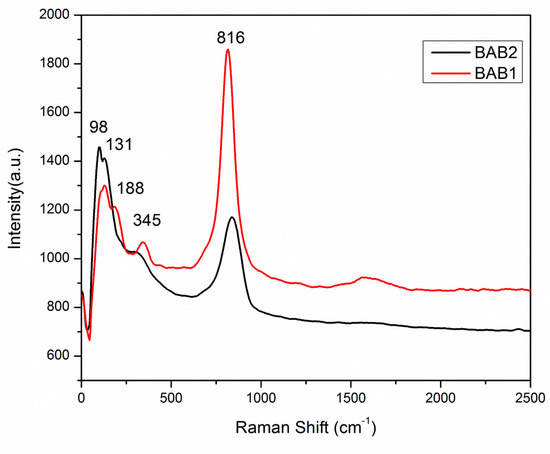 Raman spectroscopy was used to examine the local structure of the synthesized polycrystalline photocatalysts powder. The Raman spectrum was recorded in the range of 0–2500 cm−1. Figure 6 shows the Raman spectra of the BiOCl/AgCl/BiVO4 heterostructure nanocomposite synthesized at pH = 1.2 and pH = 4, BAB1 and BAB2 respectively. For two samples, Raman spectra exhibit different behavior and these are the typical vibrational bands of BiVO4 and BiOCl. As seen in Figure 6, the BAB2 photocatalyst shows a dominant peak at 816 cm−1, which is ascribed to the V-O symmetric stretching bond of the tetrahedral BiVO4 [27,28]. The intensity of this band was higher in sample BAB1 comparing to BAB2, with a slight shift to the lower band. In the BAB1 sample, two peaks at 98 cm−1 and 131cm−1 can be ascribed to the A1g external and internal Bi–Cl stretching modes respectively, while the peak at 188 cm−1 was assigned to the Eg internal Bi–Cl stretching mode [29,30,31]. The Raman bands centered at 345 cm−1 represent the deformation mode of V–O tetrahedron vibrations of BiVO4 in photocatalyst BAB2. Similar vibration modes were detected for BAB2 as well, but with the main peak at 816 cm−1 with a different peak intensity. This confirms that in both samples, photocatalysts BiVO4 and BiOCl exist.