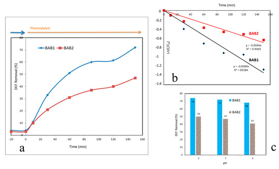 Photocatalytic degradation of degradation of diclofenac (DCF) (a); the corresponding pseudo-first-order reaction kinetics (b); and corresponding photocatalytic degradation efficiencies in solutions with a different pH (c) for BAB1 and BAB2 photocatalysts.