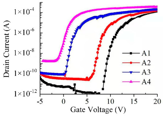 The transfer properties of Cs-IGZO TFTs from sample A1 to A4 were measured and plotted in Figure 2. In the measurement of Cs-IGZO TFTs transfer properties, the drain–source voltage (VDS) is 10 V, with sweeping the source–gate voltage (VGS) from −5 to +20 V. Vth, μFE, and S.S of TFTs are extracted by the transfer properties of the TFTs and represented in Table 2, respectively. As observed with Figure 2 and Table 2, the Vth of samples A1 to A4 gradually reduce from 7.9 V to −1.7 V, which indicates that the switching performance of Cs-IGZO TFTs can be adjusted with the changing of Cs+ ions concentration. The μFE of samples A1 to A4 increase from 8.6 cm2 V−1 s−1 to 21.5 cm2 V−1 s−1, indicating that the transport speed of electrons of a-IGZO film can be significantly improved by increasing the Cs+ ions concentration. The S.S of samples A1 to A4 decreases from 0.28 V/decade to 0.22 V/decade, which means the defects inside the TFTs can be tapered by increasing the Cs+ ions concentration. In addition, the OFF current (IOFF) of samples A1 to A4 are calculated to be 5.6 × 10−11 A, 3.5 × 10−10 A, 0.8 × 10−10 A, and 6.7 × 10−8 A, which indicates that the drive characteristics of Cs-IGZO TFTs can be deteriorated by increasing the concentration of Cs+ ions.
