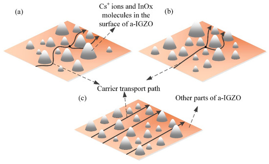 According to the XRD and AFM results, the movement states of carriers in Cs-IGZO films with different Cs+ ions adsorption are given and represented in Figure 6. Figure 6a represents the electrons transport path inside the Cs-IGZO film when the Cs+ ions are barely adsorbed, like sample A1. In this state, most of the metal–oxide molecules in the surface of the Cs-IGZO films are randomly arranged. Since the electrons move in the oxygen vacancies in Cs-IGZO films, the electrons need to move around each molecule, therefore the transmission paths represent the irregular way.