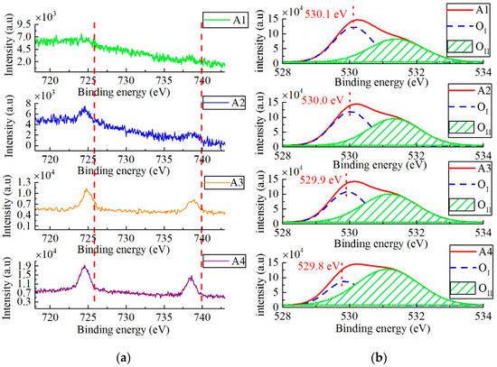 As observed in Figure 7b, the peak intensities in OII spectra of samples A1 to A4 gradually increase, indicating that the oxygen vacancy concentrations of IGZO film can be significantly improved by increasing the Cs+ ions adsorbed degree. The area percentage under the peak of OII spectrum in O1s spectra (OII/(OI+OII)) of samples A1 to A4 are calculated to be 48.1%, 51.9%, 52.7%, and 72.3%, respectively, ascertaining that the high adsorption degree of Cs+ ions can generate more oxygen vacancies inside the a-IGZO film. Since the oxygen vacancy work as the donor impurities of IGZO films, this increased oxygen vacancy of Cs-IGZO films is attributed to the improvement of electrical properties of TFTs, including the negative shift of Vth and the increase of μFE and the carrier concentration.