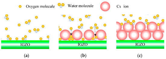 Schematic diagram of adsorption of H2O and oxygen molecules in the surface of Cs-IGZO and amorphous InGaZnOx (a-IGZO) films. (a) barely Cs+ ions adsorbed IGZO film. (b) part of Cs+ ions adsorbed IGZO film. (c) large amount of Cs+ ions adsorbed IGZO film.
