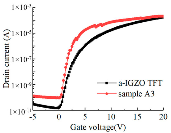 The performance of the optimized Cs-IGZO TFT (sample A3) and a-IGZO TFT which was annealed at 400 °C for 30 min in N2 atmosphere is compared. The transfer properties of sample A3 and annealed a-IGZO TFT are represented in Figure 9, and the Vth, μFE, and S.S are calculated and represented in Table 3. As observed in Figure 9 and Table 3, sample A3 has a similar Vth to that of annealed a-IGZO TFT which is 0.2 V, and its μFE and S.S are superior to that of a-IGZO TFT, indicating the transfer properties of optimized Cs-IGZO TFT are superior to that of annealed IGZO TFT.