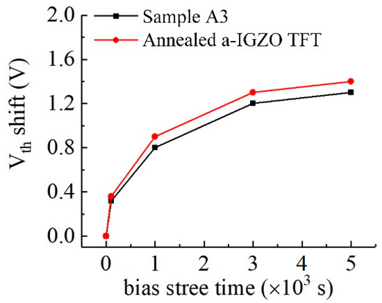 The Vth shifts under gate bias of sample A3 and annealed a-IGZO TFT are calculated and shown in Figure 10.