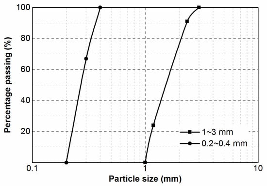 Concrete specimens were prepared with ordinary Portland cement (P.O. 42.5, Tianjin, China), tap water, local natural sand (distributed within 0~5 mm), and coarse aggregate (gravel, distributed within 5~25 mm). We adopted two rubber particle sizes (1~3 mm and 0.2~0.4 mm) in this study, whose particles size distributions were displayed in Figure 2. All of the rubber particles were obtained by cutting scrap rubber tire casings, which contain 37% natural rubber, 25% butadiene rubber, 30% carbon black, and 8% other additives. All other chemicals used in this study were of Analytical Reagent (AR) grade.