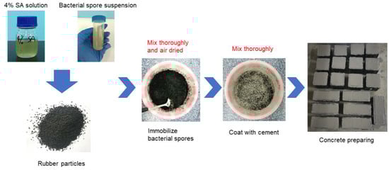- The bacterial spore suspension was prepared according to the method described in Section 2.1. Then, the rubber particles were mixed with the bacterial spore suspension and 4% sodium alginate (SA) solution. The ratio of SA solution, bacterial spore suspension, and rubber particles was 1 mL:1 mL:2.2 g. The role of the SA solution was to adhere the bacterial spores to the rubber particles and coat the rubber particles to protect the spores from leaving the pores in the rubber particles. The proportion of these three substances resulted from ensuring that there were 3.75E13 bacterial spores per m3 of concrete and that there was sufficient SA solution to disperse the spores under the premise that the amount of rubber particles could be determined.