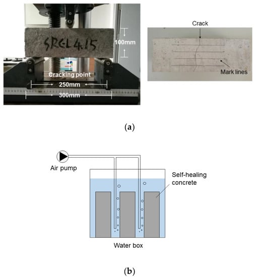 Three prismatic specimens (100 mm × 100 mm × 300 mm) were prepared to observe the capacity of each type of concrete to self-heal cracks. The cracks were created at the concrete age of 7 days using a three-point bending method (see Figure 4a). The specimens were loaded at a rate of 0.5 mm/min until a clear crack appeared at the subface. The three specimens of each type of concrete were loaded to a different extent to obtain cracks with different widths distributed in the range 0.2~0.9 mm. Four mark lines were drawn on the cracked surface of the concrete and the intersections of the mark lines and the cracks were used to monitor the progression of crack self-healing, as shown in Figure 4a.