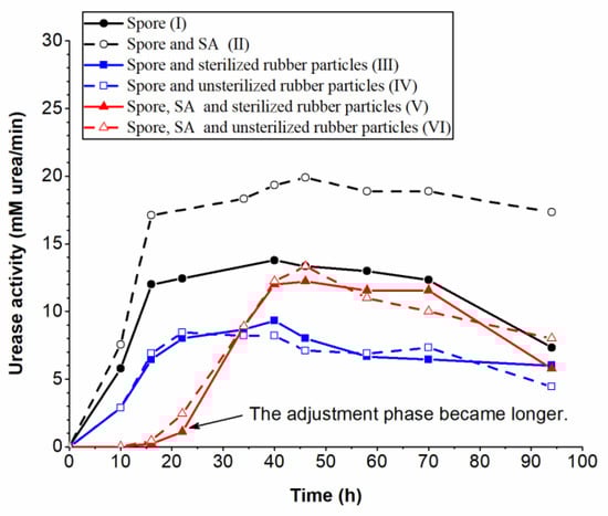 To determine the effects of rubber particles and SA on bacterial spore growth, six bottles of 100 mL of fresh liquid medium were prepared then separately inoculated with: 1 mL of bacterial spore suspension (I); 1 mL of bacterial spore suspension and 1 mL of SA solution (II); 1 mL of bacterial spore suspension and 2.2 g of sterilized rubber particles (III); 1 mL of bacterial spore suspension and 2.2 g of unsterilized rubber particles (IV); 2.2 g of sterilized spore-containing rubber particles (V); and 2.2 g of unsterilized spore-containing rubber particles (VI). All media were cultured in a shaker at a temperature of 30 °C and a rotational speed of 220 rpm for four days. The urease activities in the media were detected using a conductivity method [26] to estimate the amount of bacterial growth.