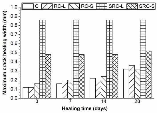 Figure 7 illustrates the maximum values of the widths of completely healed cracks for the five types of concrete at different healing times. As the healing time increased, the specimens with no self-healing agent (C, RC-L, and RC-S) exhibited improving values of maximum healed crack width, but only reached a value of 0.25 mm at 28 days. In contrast, the self-healing rubber concretes (SRC-L and SRC-S) showed a much better healing capacity, especially the SRC-L specimens that had a maximum healed crack width of 0.86 mm at three days. The reason behind this phenomenon was that the specimens with no self-healing agent were healed only by the hydration of unhydrated cement particles [7], but the self-healing rubber concretes were also healed by the bacterial mineralization. Therefore, the self-healing technique using rubber particles to immobilize bacterial spores was effective and greatly improved the self-healing capacity of the concrete.