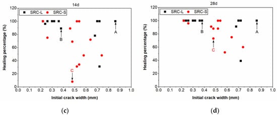 Figure 8 compares the crack healing percentage of the SRC-L concrete with that of the SRC-S concrete at different healing times. At the healing time of three days (Figure 8a), half of the cracks in the SRC-L concrete specimens had been completely repaired from an initial width of 0.22~0.86 mm, and only three cracks with an initial crack width of 0.22~0.54 mm in the SRC-S concrete had the healing percentage of 100%. In addition, we found that the initial crack width had no influence on the healing percentage. For example, Crack A in the SRC-L concrete with a width of 0.86 mm was completely healed, but Crack B with a width of 0.38 mm had a healing percentage of 11%. The widest crack had the best healing capacity, which may have resulted from the higher bacterial concentration in this crack. This proves that the distribution of bacterial carriers in the self-healing concrete was not uniform. As the time increased, the healing percentages of the cracks continued to improve, as shown in Figure 8b,c. When the healing time reached 28 days, almost all of the cracks in the SRC-L concrete were completely repaired and the maximum healed crack width was 0.86 mm. The cracks in the SRC-S specimens all reached healing percentages higher than 50%, and the maximum healed crack width was 0.52 mm. It was clear that the crack-healing capacity of the SRC-L concrete was better than that of the SRC-S concrete, indicating that the rubber particles with a larger size were more suitable for immobilizing bacterial spores in self-healing concrete. This may be due to the fact that larger rubber particles can provide more space for bacterial growth, avoiding bacteria death due to squeezing in the concrete matrix. Moreover, the bacteria can move in the cracks during the process of incubation, providing calcium carbonate crystals to those locations that do not have carriers at the beginning. This happened in Crack C in Figure 8, which had a healing percentage of zero in the first seven days after incubation, but was repaired gradually after the healing time of seven days. Bacterial transport in the cracks can help to heal cracks in locations with no bacterial carriers, improving the healing capacity of the self-healing rubber concrete.