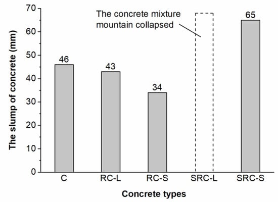 The slumps of the five types of concrete are shown in Figure 9. It can be seen that the slumps of the RC-L and RC-S concretes were 43 mm and 34 mm, respectively, which decreased by 6.5% and 26.1%, respectively, compared with the C concrete (46 mm). This is due to the ability of the rubber particles to absorb the free water in the fresh concrete into the pores on their surface, reducing the fluidity of the fresh mixture [21]. Moreover, the rubber particles with a small size had a better capacity to absorb water than the rubber particles with a large size, as they had a larger surface area. The SRC-S concrete had a 41.3% higher slump (65 mm) than the C concrete, whereas the fresh mixture of the SRC-L concrete collapsed when measuring the slump. These phenomena indicate that the presence of the healing agent led to a more flowable mixture. The previous studies [17,27] show that bacterial nutrients, such as yeast extract, urea, and calcium salt, which were mixed with fresh concrete in self-healing concrete, had a negative effect on cement hydration in the early age.