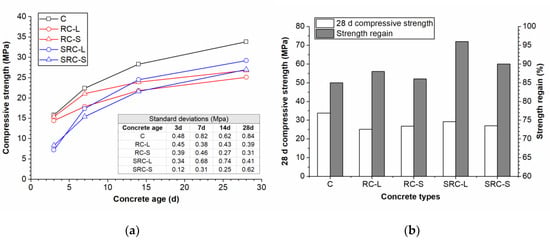 The compressive strengths (a) and the strength regain (b) of the five types of concrete.