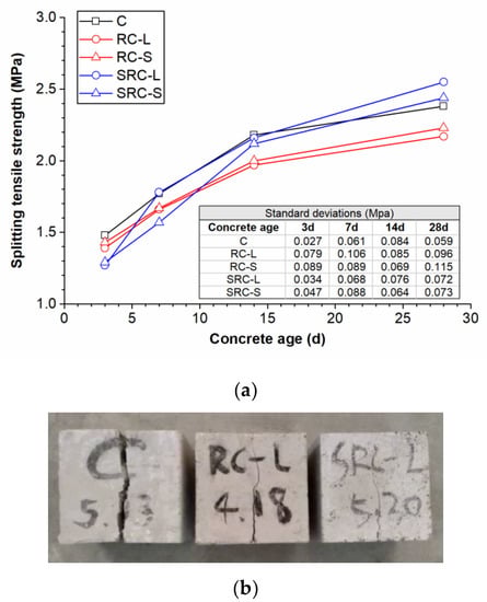 The splitting tensile strengths of the five types of concrete at different ages are plotted in Figure 11a. It can be seen that the RC-L and RC-S concretes had splitting tensile strengths that were lower than that of the C concrete during the curing time, and were reduced by 8.8% and 6.3%, respectively, at the age of 28 days. The reason may be that the weak bonding between the rubber particles and the cement accelerated the concrete’s breakdown [21]. The two types of self-healing concrete had low splitting tensile strengths at three days because of the low cement hydration at early ages. However, the splitting tensile strengths of the self-healing concrete began to exceed those of the corresponding normal rubber concretes from the age of 14 days. At the age of 28 days, the splitting tensile strengths of the SRC-L and SRC-S concretes were 2.55 MPa and 2.44 MPa, respectively, which is an improvement of 17.5% and 9.4%, respectively, over the corresponding normal rubber concretes (2.17 MPa and 2.23 MPa), and an improvement of 7.1% and 2.5%, respectively, over the C concrete (2.38 MPa). This may be because the SA coating on the rubber particles in the self-healing concrete can function as a coupling agent to improve the bonding of rubber particles and cement.