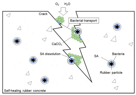 The test results have proved that the self-healing concrete using rubber particles to immobilize bacterial spores can produce precipitations in the cracks to repair them. The working mechanism of the self-healing rubber concrete is displayed in Figure 12. When the concrete was not cracked, the bacterial spores were dormant in the pores of the rubber particles, which were coated by SA. After the cracks appeared on the surface of the concrete, the oxygen and water in the external environment can enter into the concrete through the cracks. The SA, coated on the rubber particles on the surfaces of the cracks, was dissolved slowly by the water and the bacterial spores were released from the rubber particles. These bacterial spores were activated by the oxygen and water in the cracks and began to grow, using the nutrients in the concrete. Then, calcite precipitation was produced by the bacterial cells in the cracks and sealed the cracks gradually. In this process, some bacterial cells can be transported with the water flow to locations with no bacterial carriers to produce crystals in the cracks.