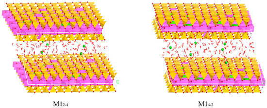 The water molecules among the TOT (Tetrahedron-Octahedron-Tetrahedron) crystal layers are added by the Adsorption Location module. Since the amount of water molecules in the interlayers can affect the interlayer spacing of the montmorillonite, when the montmorillonite contains a layer of water molecules, the layer spacing is about 12.5 Å, and the two layers are about 15.0 Å [33,34]; in order to study the influence of layer charge characteristics of montmorillonite on water molecules and Ca2+ in the interlayer, this paper used the established 8a × 4b × 1c super-cell to simulate. Two-hundred-and-fifty-six water molecules were added into the montmorillonite model to form two layers of water molecules, and the corresponding Ca–montmorillonite layer spacing was 15.0 Å [35]. Corresponding to four types of Ca–montmorillonites with different charge densities, five different ion substitution modes and substitution ratios, twenty montmorillonite hydration models were finally established (taking M1 as an example, as shown in Figure 1).