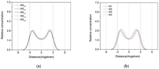 In addition, the charge density of montmorillonite had a significant effect on the distribution of Ca2+ in the interlayer from Figure 3. With the increase of the layer charge density, the Ca2+ moved more significantly from the middle of the layer to the siloxane surface on both sides, as shown in the figure, migration peaks increased or multiple migration peaks appeared. This phenomenon was more pronounced as the proportion of the charge in the tetrahedron increased. The Ca2+ among the layers were subjected to the negative potential electrostatic attraction of the isomorphism of the tetrahedron, causing the Ca2+ to diffuse to the sides. Since the montmorillonite with higher charge density had a large number of negative potential points, the Ca2+ in the interlayer were subjected to strong electrostatic force, and the diffusion to the siloxane surface was more obvious. Therefore, in the same crystal structure of montmorillonite, with the increase of the charge density of montmorillonite, the Ca2+ appeared to gradually shift from the vicinity of the central axis to the two sides in the montmorillonite layer.