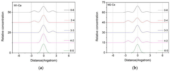 As can be seen from the left figure, if the layer charge density is fixed, the difference in the substitution positions will significantly affect the distribution of Ca2+. When ion substitution occurred, mostly in tetrahedrons (0-6, 2-4, 3-3), Ca2+ were shifted closer to the Z-axis due to their closer proximity to the substitution source, and the distribution was more uniform. A low peak appeared at a distance (2.8 Å) closer to the Ot, but most of the Ca2+ were still concentrated in the middle of the layer, about 5.5 Å from the Ot. When the substitution source was mostly in octahedrons (4-2, 6-0), the radial distribution of Ca2+ was less affected due to the spatial long-range effect mentioned in Section 3.1.2.