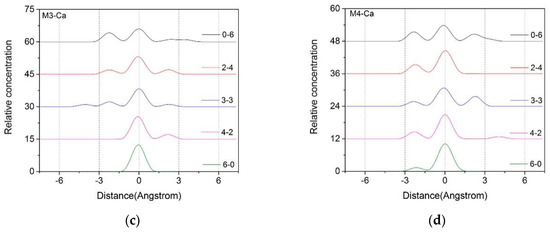 From Figure 7b, we can find that with the increase in the charge density of montmorillonite, due to the negative charge of the Si–O surface increases, some of the Ca2+ moved toward the Si–O surface under the action of electrostatic attraction. Therefore, some new peaks appearred around 2.5 Å–3.5 Å, which was more obvious when the layer charge density of the montmorillonite was higher (M3, M4).