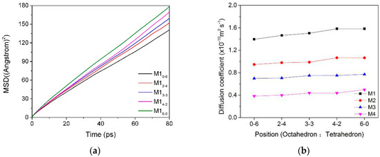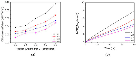 The mean square displacement curves and self-diffusion coefficients of water molecules in the interlayer of the Ca-montmorillonite with different charge characteristics are shown in Table 3 and Figure 4. We can find that the charge position and density of montmorillonite have a certain influence on the diffusibility of water molecules in the interlayer. With the proportion of charge density produced by montmorillonite octahedral substitution increased, the mobility of water molecules in the inter-layer domain was higher and, thus, had a higher diffusion coefficient (Figure 4a, M1). It can be inferred that the self-diffusion coefficient of water molecules was affected by the polarity of the montmorillonite siloxane surface. In other words, if the total charge was fixed, when the charge source was generated in the tetrahedron, due to the short-range spatial effect, the water molecules were subjected to strong polar attraction and difficult to move, so the self-diffusion coefficient was low.