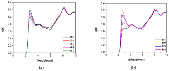 The radial distribution function reflects the probability density among two types of atoms and can reflect the aggregation characteristics of ions in the system [42]. By analyzing the radial distribution function among two different particles in the montmorillonite interlayer domain, we can infer whether there is a force among the two types of atoms and the magnitude of their force. The radial distribution function of the system is the algebraic averaging of the radial distribution functions of all the same atoms, reflecting the atomic distribution characteristics of the system [39]. The calculation formula is: