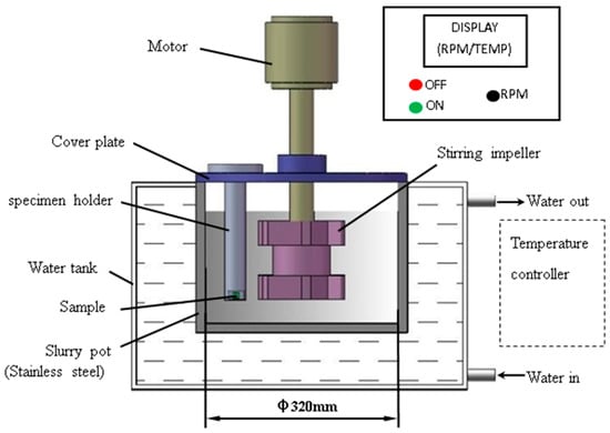 Erosion-corrosion tests were carried out by a self-made slurry pot erosion apparatus (Model: MCF-14) and its schematic diagram is shown in Figure 1, which is similar to previous reference [28]. This apparatus mainly consisted of a speed regulating system, temperature controller, and slurry pot accessories. Motor with a maximum rotation speed of 1450 rpm drove the stirring impeller to mix slurry and keep the erodent suspended. This apparatus was equipped with a temperature controller at the top and pipes at the bottom of a water bank, which allows tap water to flow through the water regulating system for maintaining the fixed test temperature. The temperatures of the sample and the water were measured by thermocouples. Furthermore, the results were displayed and recorded in real time by the control cabinet with the computer. The specimen holder was fixed on the cover plate. The slurry was prepared according to the following requirement and poured into the slurry pot.