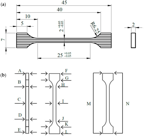 Nominal dimensions of a single sample (a) and measurement points (b).