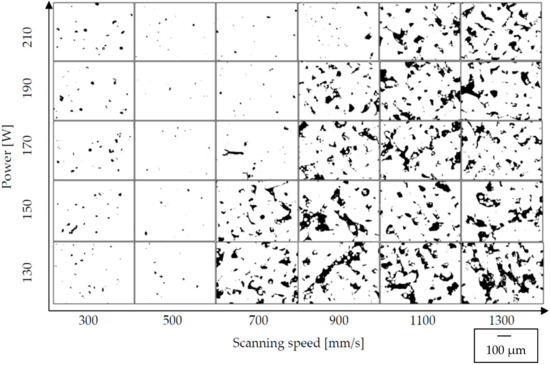 Polished and etched surfaces of cylindrical samples were subjected to microscopic observations. The effect can be seen in Figure 2. It was concluded that the change in scanning speed as well as the change in laser power significantly affected the shape and the number of pores.