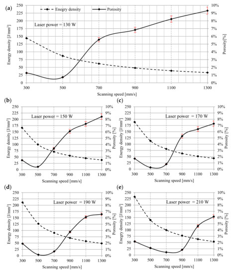 The influence of scanning speed and energy density on the porosity: (a) 130 W, (b) 150 W, (c) 170 W, (d) 190 W, (e) 210 W.