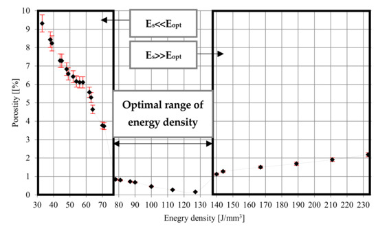 - The highest density of samples (porosity not exceeding 0.5%) was obtained for samples melted with energy density in the range of 100–127 J/mm3.